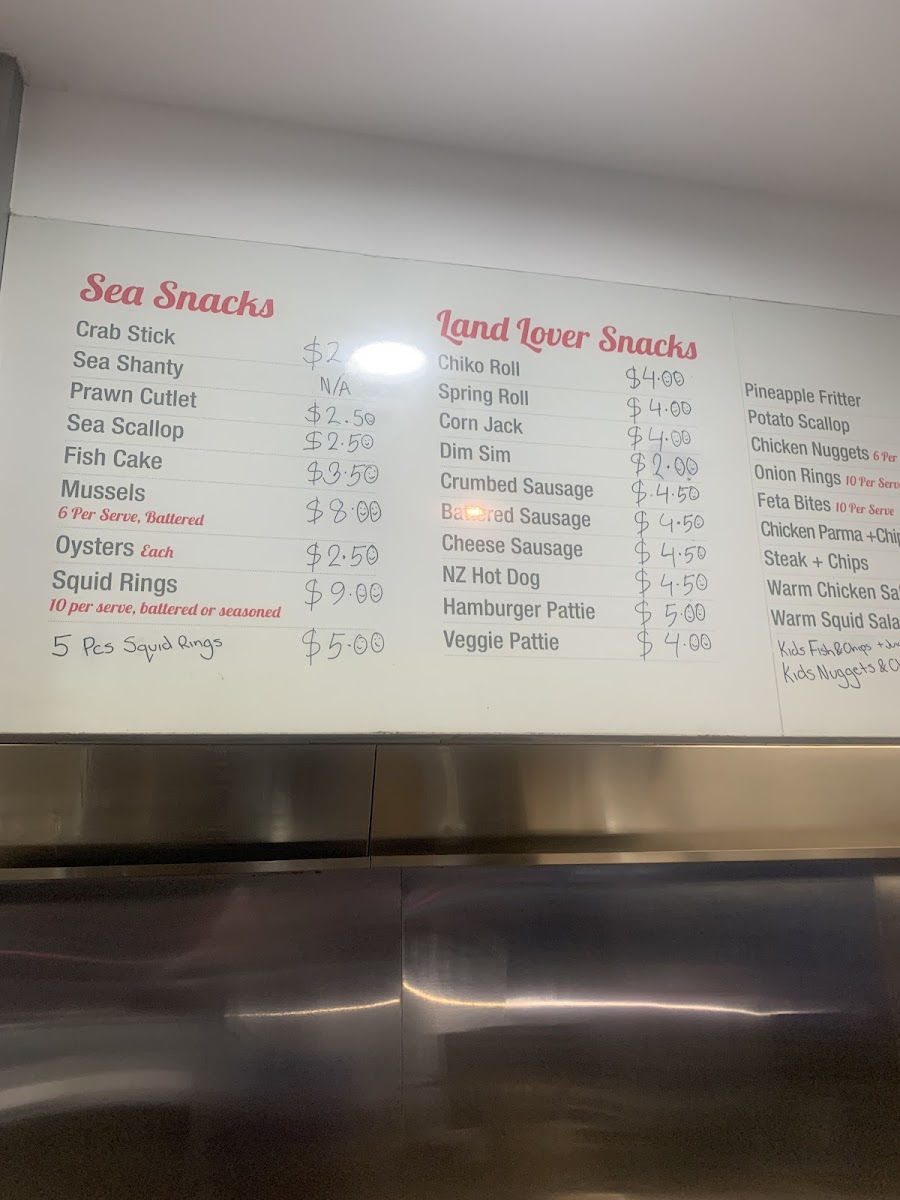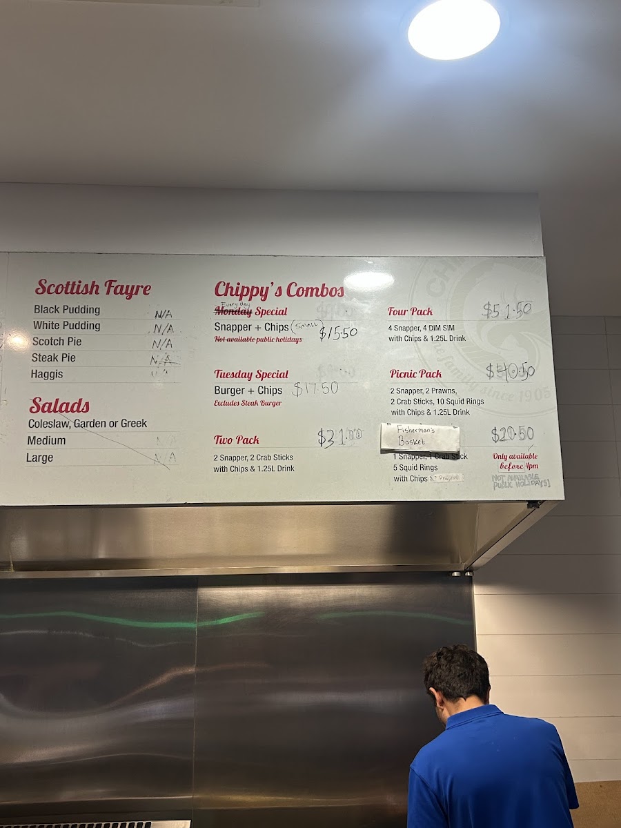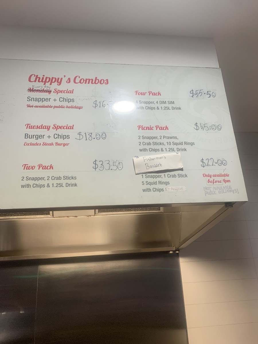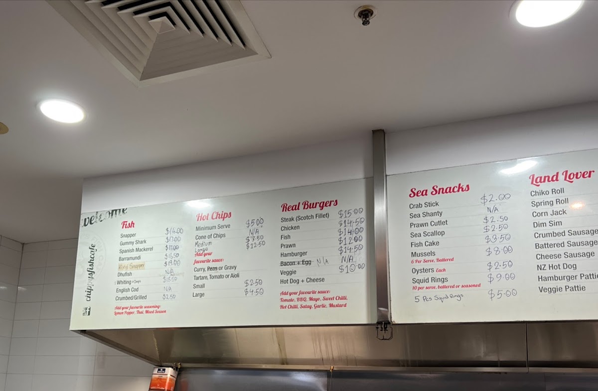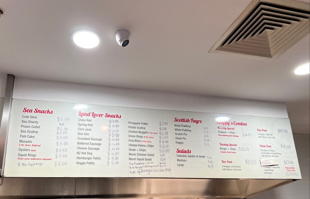 Chippy's Fish Cafe offers a variety of delicious options that cater to a wide range of tastes. Their Chippy's Combos include the Two Pack and Four Pack, perfect for those looking for a mix of seafood and chips, as well as the Snapper and Chips Picnic Pack and the Fisherman's Basket for a more filling meal. If you're in the mood for something light, their Chips are a classic choice. For a refreshing drink, you can choose from Coca-Cola 600ml Varieties or Coca-Cola 1.25L Classic. The Land Lover Snacks section features treats like Pineapple Fritter, Hamburger Patty, Corn Jack, Chiko Roll, and Spring Roll. A wide selection of fresh fish is also available, including Spanish Mackerel, Gummy Shark, Barramundi, English Cod, and King Snapper. For those with little ones, the Kids' Packs offer choices like Kids' Pack Fish, Kids' Pack Squids, and Kids' Pack Nuggets. Chippy's also serves a variety of hearty Burgers, including the Prawn Burger, Veggie Burger, Scotch Fillet Steak Burger, Chicken Burger, and Fish Burger. Don’t forget to complement your meal with one of their delicious Sauces, such as Tomato Sauce, Aioli Sauce, Gravy, Curry Sauce, or Tartare Sauce. For a quick snack, try the Sea Snack options like Crab Stick, Fish Cake, Prawns, Sea Scallops, and Squid Rings. With so many tasty options, Chippy's Fish Cafe is a great place to enjoy a satisfying meal.