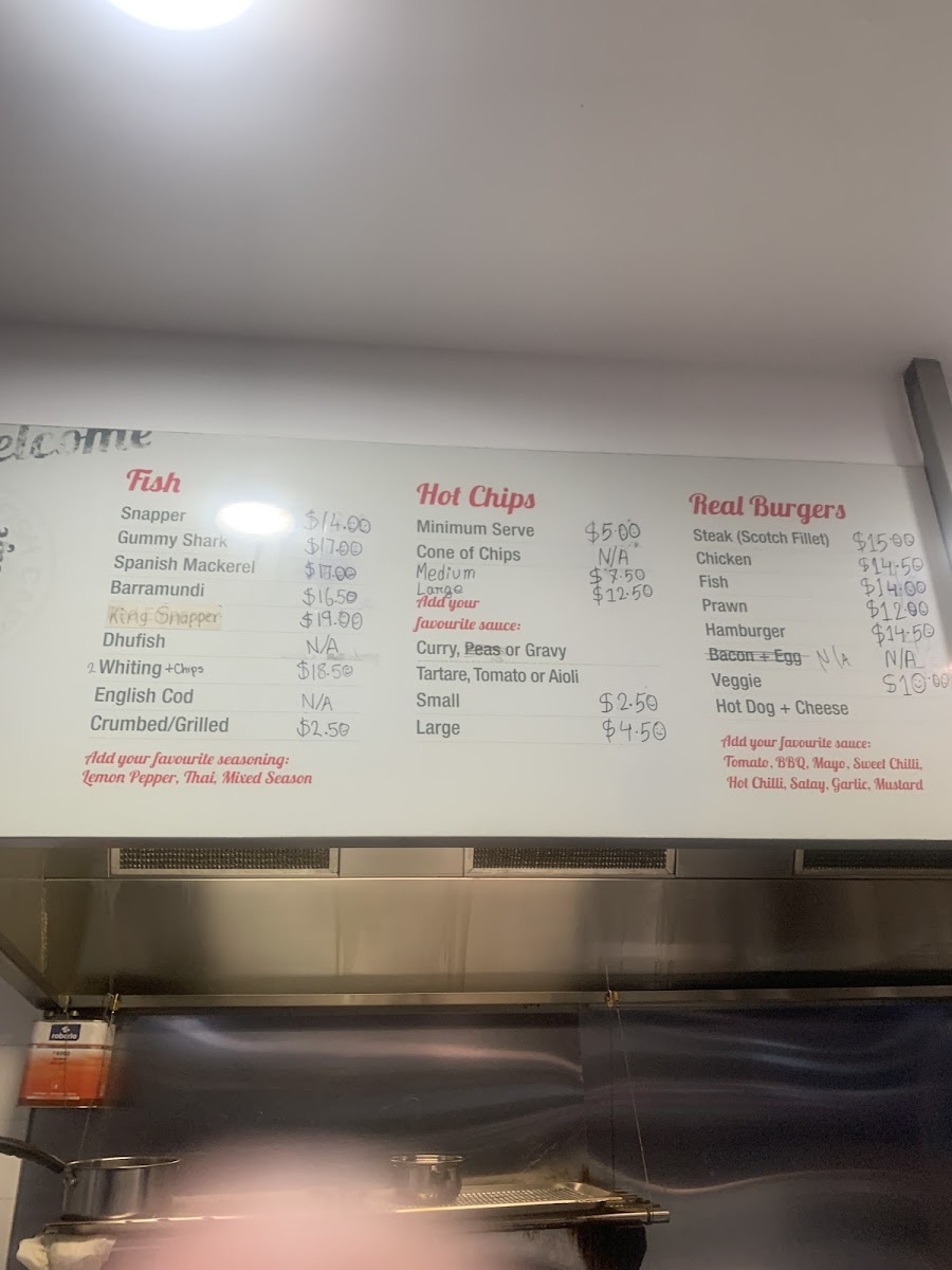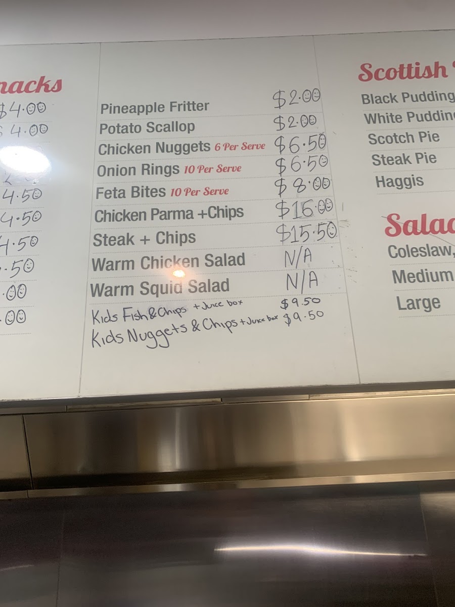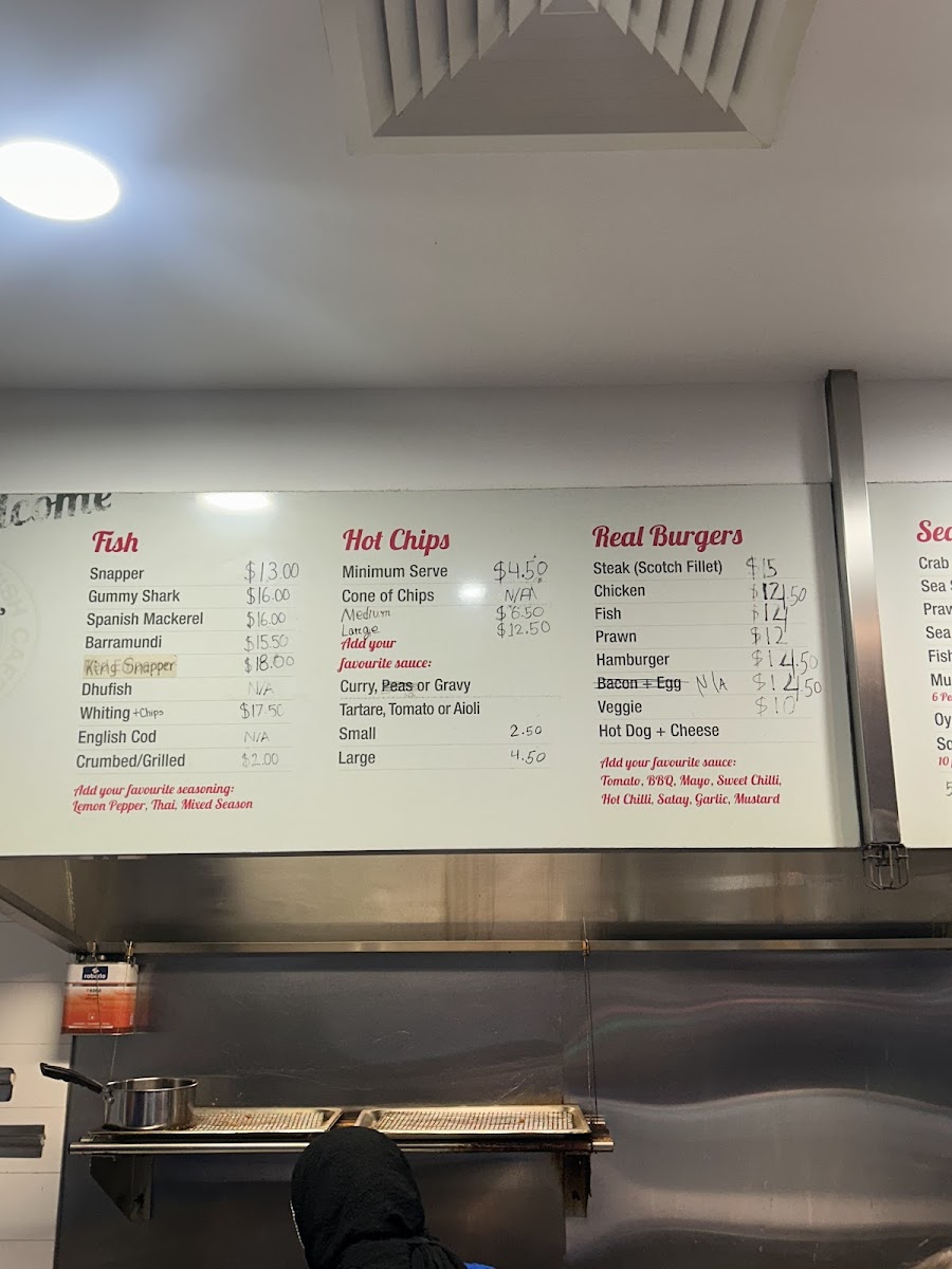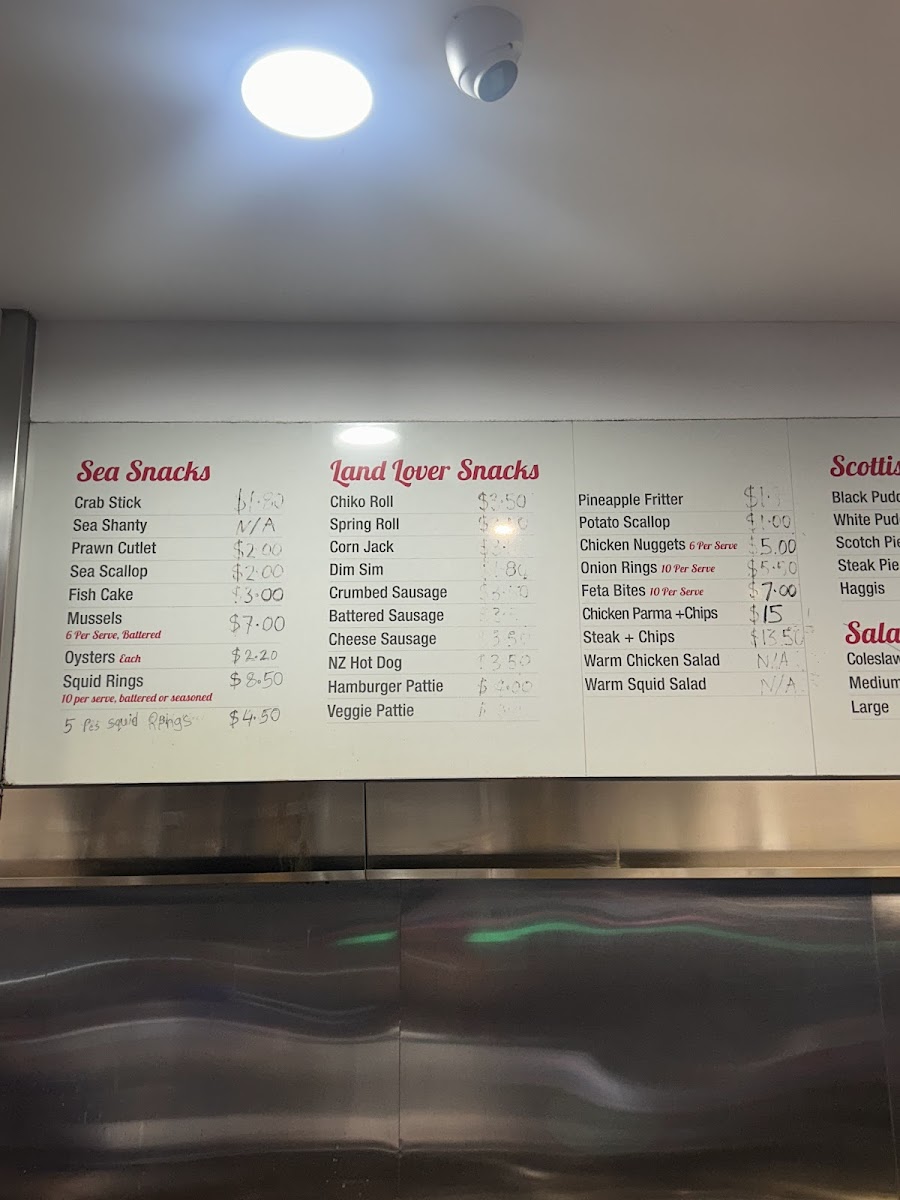 Chippy's Fish Cafe offers a variety of delicious options that cater to a wide range of tastes. Their Chippy's Combos include the Two Pack and Four Pack, perfect for those looking for a mix of seafood and chips, as well as the Snapper and Chips Picnic Pack and the Fisherman's Basket for a more filling meal. If you're in the mood for something light, their Chips are a classic choice. For a refreshing drink, you can choose from Coca-Cola 600ml Varieties or Coca-Cola 1.25L Classic. The Land Lover Snacks section features treats like Pineapple Fritter, Hamburger Patty, Corn Jack, Chiko Roll, and Spring Roll. A wide selection of fresh fish is also available, including Spanish Mackerel, Gummy Shark, Barramundi, English Cod, and King Snapper. For those with little ones, the Kids' Packs offer choices like Kids' Pack Fish, Kids' Pack Squids, and Kids' Pack Nuggets. Chippy's also serves a variety of hearty Burgers, including the Prawn Burger, Veggie Burger, Scotch Fillet Steak Burger, Chicken Burger, and Fish Burger. Don’t forget to complement your meal with one of their delicious Sauces, such as Tomato Sauce, Aioli Sauce, Gravy, Curry Sauce, or Tartare Sauce. For a quick snack, try the Sea Snack options like Crab Stick, Fish Cake, Prawns, Sea Scallops, and Squid Rings. With so many tasty options, Chippy's Fish Cafe is a great place to enjoy a satisfying meal.