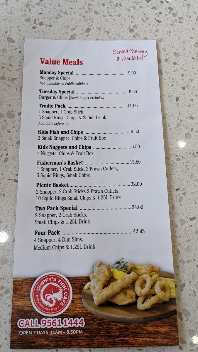 Includes one snapper, one crab stick, two prawns, five squid rings and small chips.